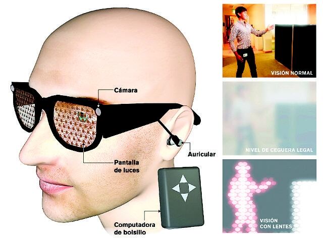 Primero, unas cámaras de video colocadas en el marco del lente detectan objetos y personas cercanas. De ahí, una especie de “computadora”, tan pequeña que puede llevarse en el bolsillo, recibe las señales de la cámara y las proyecta en la fina pantalla del lente.