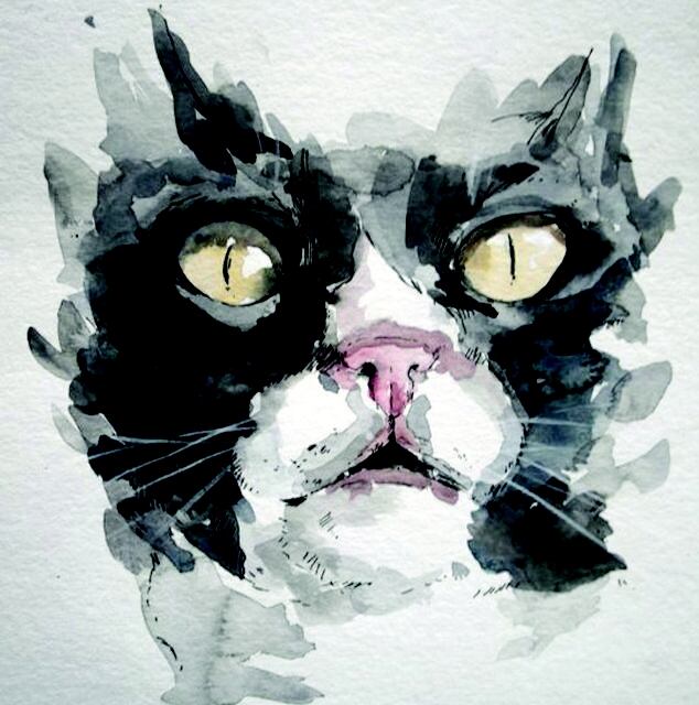 Retrato de Cho Cho es parte de Ailuromanía , serie de retratos de gatos en la que utilizo la técnica de la acuarela y otros medios, como tintas, acrílicos y lápices de color. Me agrada probar con distintos tipos de papel y con diferentes tamaños de formato. En este caso utilicé acuarela y tintas sobre papel. Sus dimensiones son de 23 cm x 31 cm. Me gusta la pincelada de manera que pueda jugar con la mancha, la veladura, las transparencias y las tonalidades para crear atmósferas distintas. Como recurso complementario utilizo el dibujo y la trama, algunas veces con tinta o con lápiz, ya que me agrada el efecto que da la combinación del lápiz con la acuarela.
