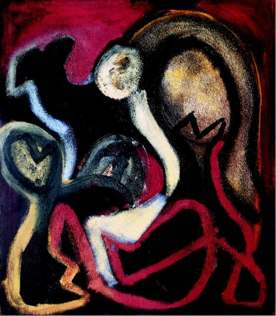 Con pigmentos y materiales de ferretería sobre yute empezó a plasmar lo que él llama “cuestionamientos”. Trabajando directamente con las manos, fue incorporando los materiales con cola de carpintero, los que se revelan sorpresivamente a través del proceso creativo. En el cuadro predominan los colores del barro y el yute en contraste con las piedras molidas del mármol y el granito.
