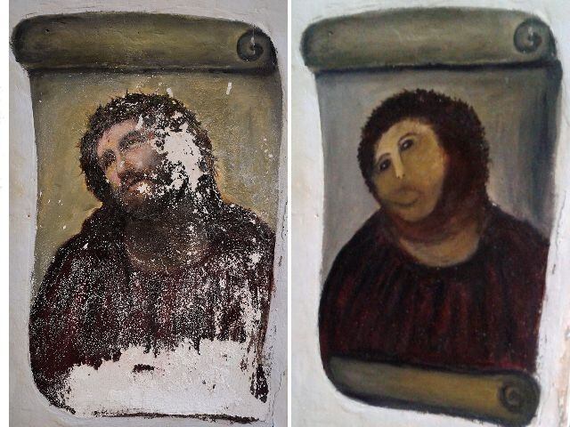 Cecilia Giménez provocó el furor de los protectores del patrimonio y la risa de los internautas de medio mundo por su trabajo muy personal, en el que el Cristo se convirtió en un personaje con pelo similar al de un mono, sin boca y con la nariz estilizada.
