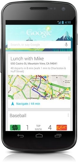 Google Now es un complemento al buscador integrado en Android Jelly Bean (4.1 y 4.2), un avanzado "asistente digital" cuya principal característica es su capacidad de predecir la información que el usuario necesita. En vez de tener que abrir una aplicación de clima, al abrir Google Now la temperatura del día estará ahí, mostrada en una tarjeta. También aparecerá el tiempo que demorará el usuario en llegar a su trabajo, basado en datos de Google Maps e información de tráfico.
