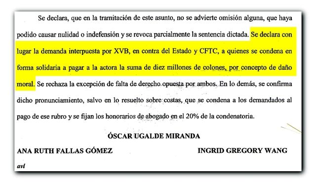 En el fallo, los jueces, Óscar Ugalde Miranda, Ana Ruth Fallas Gómez e Ingrid Gregory Wang sentenciaron al legislador y al Estado, a pagar en forma solidaria a la demandante la suma de ¢10 millones por concepto de daño moral.