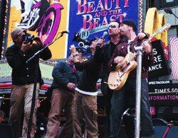 Los seguidores gritaron y saludaron a las esterllas roqueras cuando vieron al grupo encima de la camioneta cruzando el Puente de Manhattan.