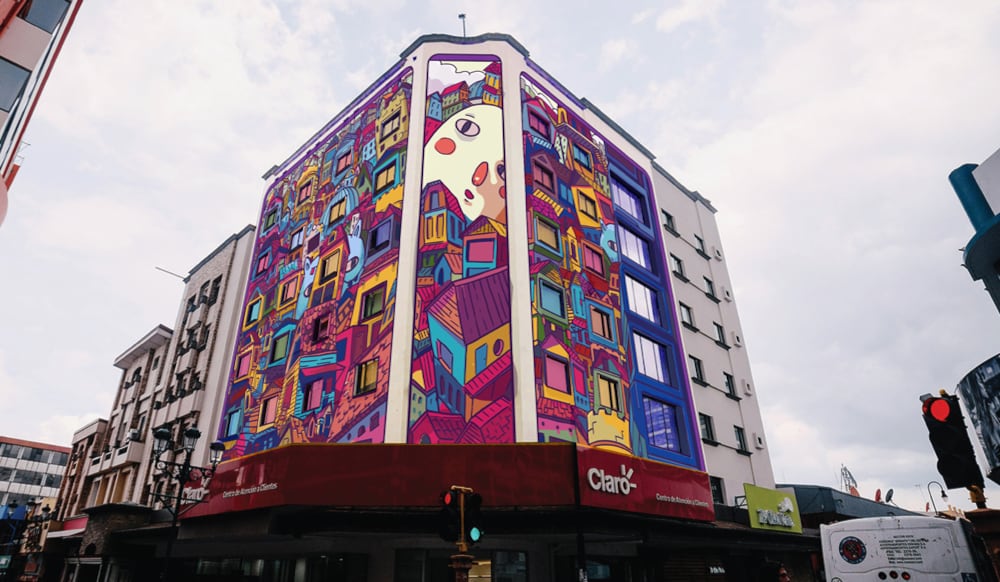 El artista Sergio Guillén y su proyecto Buscando el gato, resultó ganador del concurso Tu ciudad: tu lienzo y así obtuvo el derecho de plasmar su compleja y llamativa obra en la fachada de este alojamiento capitalino.