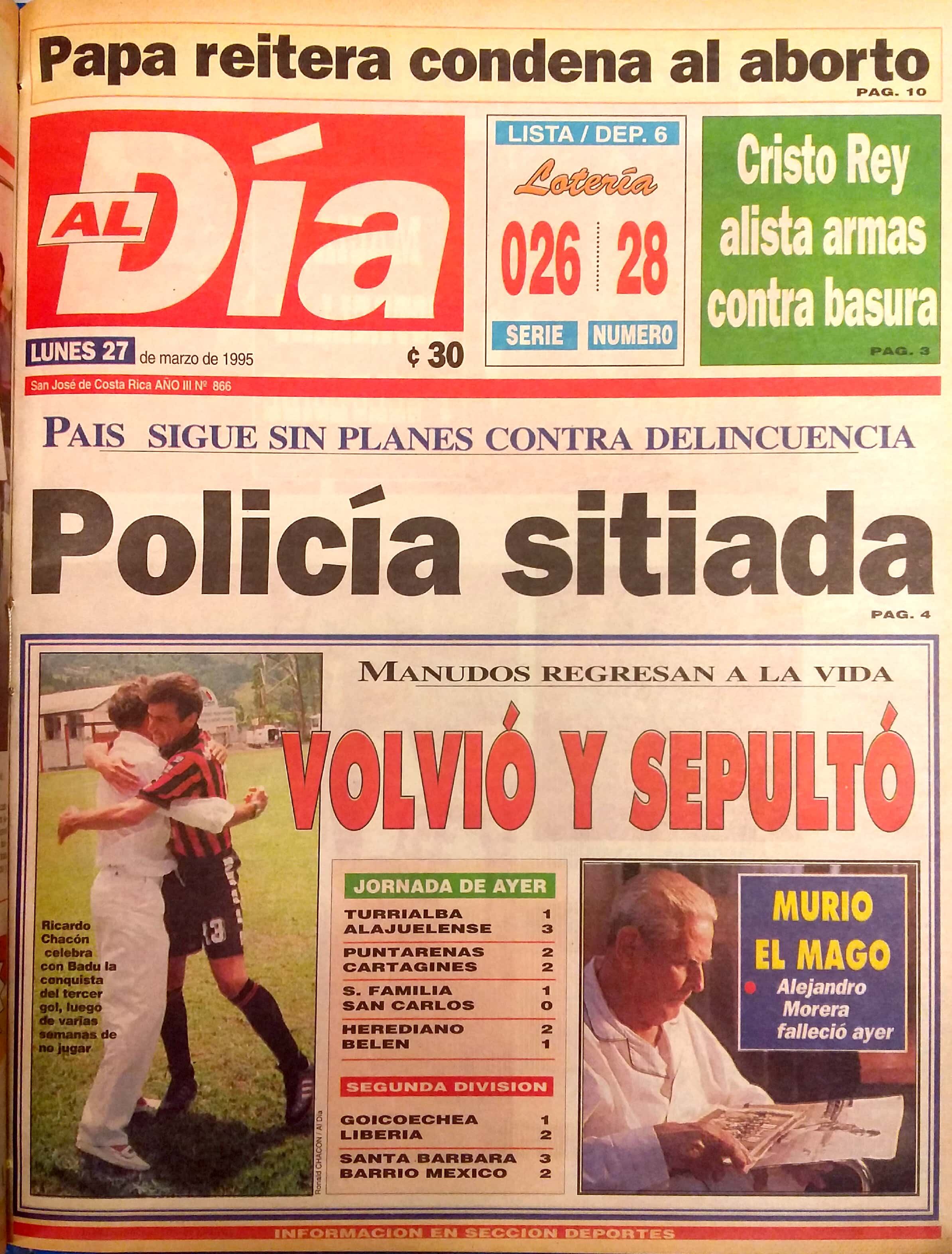 “En una ocasión sancionaron con tiro de penal al rival de la Liga. Fue una decisión arbitral injusta a juicio de los propios jugadores beneficiados. Lo tenía que lanzar don Alejandro, así que colocó el balón en su sitio, esperó el silbatazo del central y tocó la bola suave a las manos del guardameta. Quizá en estos tiempos, el ‘fusilamiento’ habría sido total. En ese entonces, don Alejandro Morera hacía estas cosas, cuando de ser justos se trataba”, comentó Soto en la página 21 del periódico Al Día del martes 28 de marzo de 1995.
