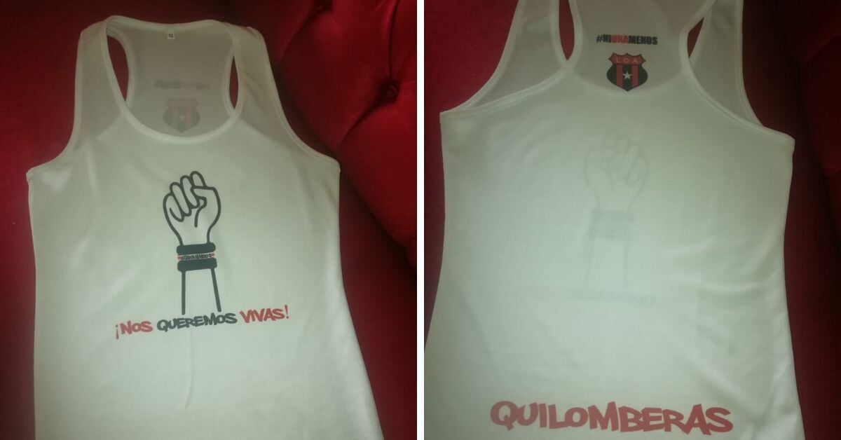 Todas vestían una camiseta que ellas idearon y mandaron a hacer. Al frente muestra una mano cerrada que simboliza que se acabó el conteo de víctimas, más la leyenda: “¡Nos queremos vivas!". Por atrás, la prenda tiene el hashtag #NiUnaMenos y el escudo de la Liga. Abajo dice “Quilomberas”, al ser la peña a la que pertenecen.