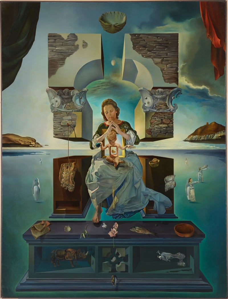 Siguiendo la simbología del cuadro, la Virgen está dotada de altura, longitud y profundidad como representación del espacio y tiempo. Por encima de madre e hijo se sitúa, suspendida del aire, una concha de la que cuelga un huevo éste es un símbolo que representa el nacimiento, pero también el misterio de la vida y en Salvador Dalí tienen un claro precedente en la historia del arte: la Madonna con niño (vulgarmente conocida como la Madonna del huevo) del artista italiano Piero della Francesca.
