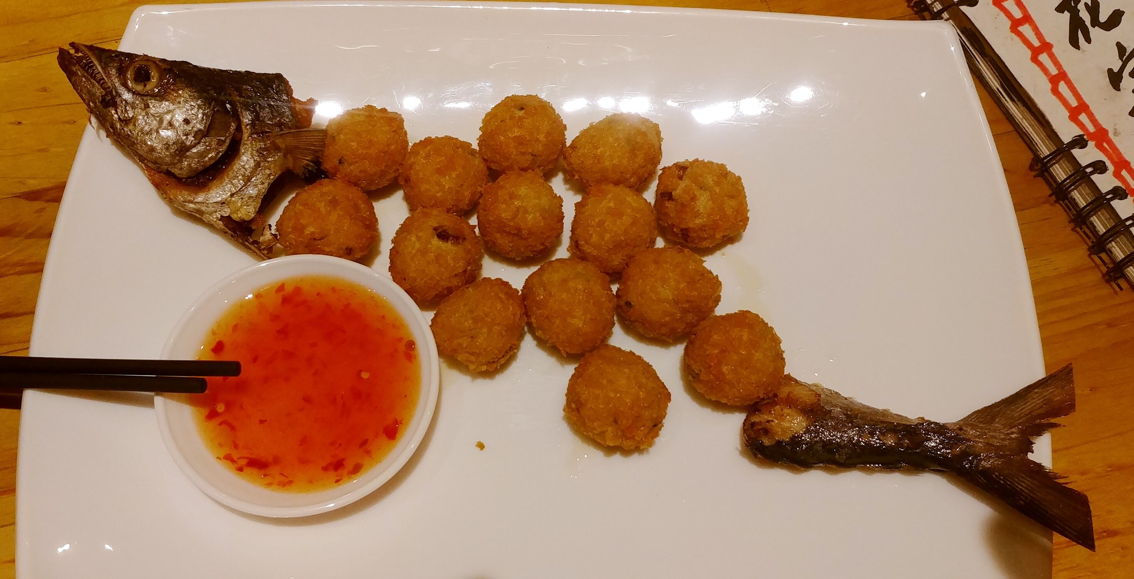 En Joy hay siempre hay novedades: la última vez, probé las bolitas de pescado fritas con salsa agridulce. Son de sabor suave, con poca presencia de sabor mar y sí un poco a hierbas frescas. Se complementan muy bien con la salsa de soya. Su textura es gomosa, poco habitual en nuestra dieta. Se sirven como entrada. Se preparan como una croqueta a partir de la carne de pescado.