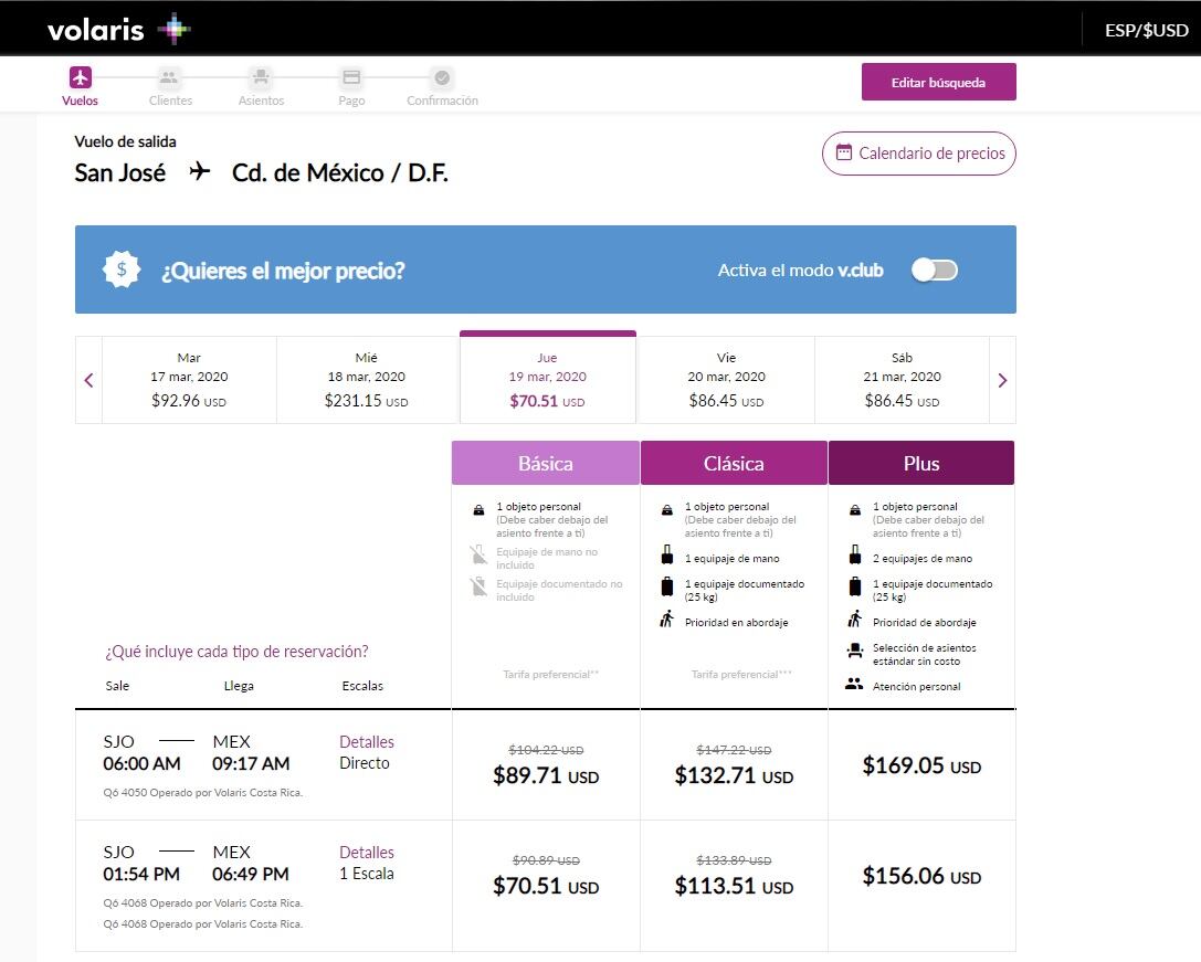 Para esas mismas fechas, el otro boleto más barato que no incluyera a Volaris es de $240 (¢138.240). Este ejercicio lo hice el miércoles 29 de enero a las 6:20 p. m.