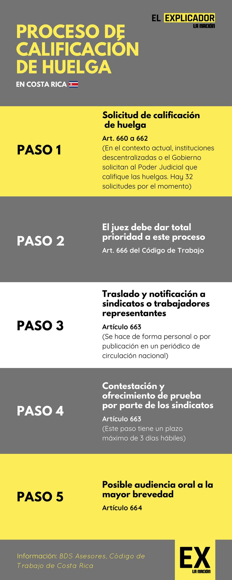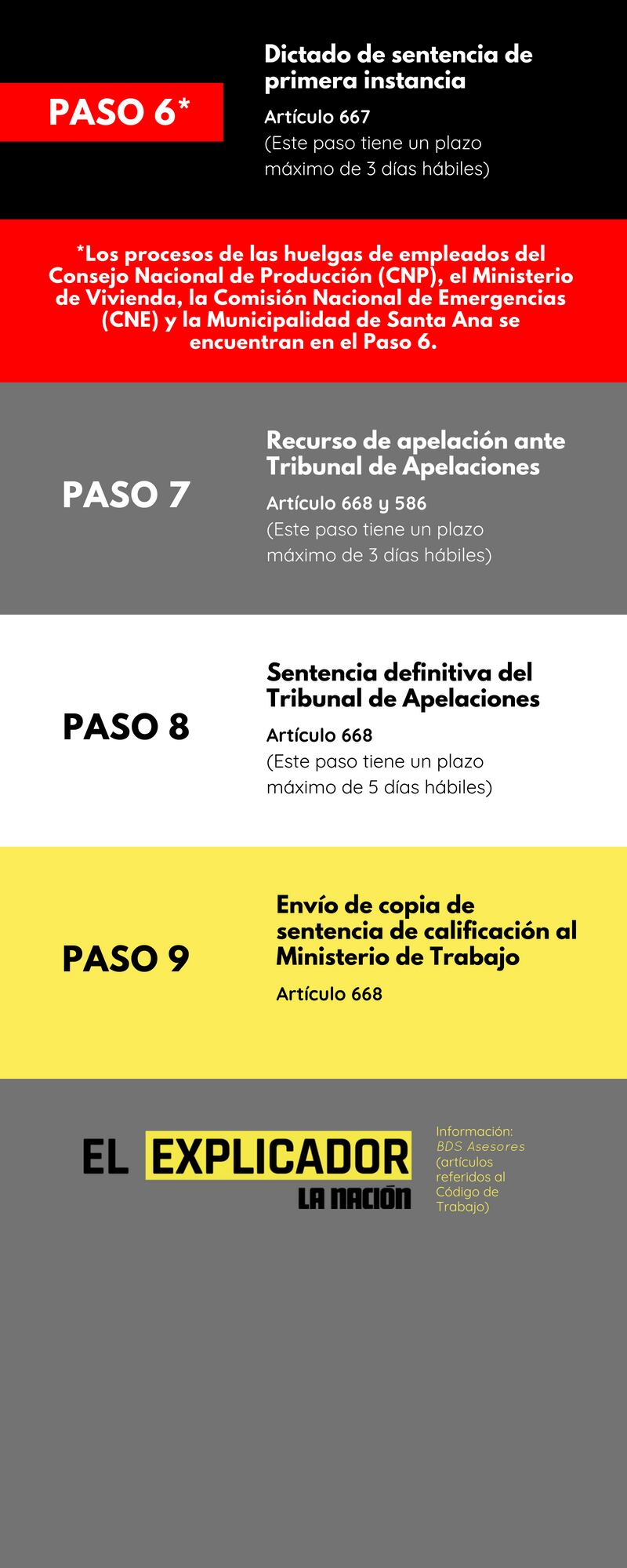 Ya hay cuatro huelgas con sentencia de ilegalidad: las del Consejo Nacional de Producción (CNP), el Ministerio de Vivienda, el Comisión Nacional de Emergencias (CNE) y la Municipalidad de Santa Ana. Otras 28 solicitudes de calificación de huelga por parte de entidades públicas están en proceso y en los próximos días sabremos sus sentencias. No obstante, de un total de 9 pasos que toma el proceso de calificación de huelgas en Costa Rica, apenas vamos por el número 6. O sea: las sentencias no son definitivas aún.