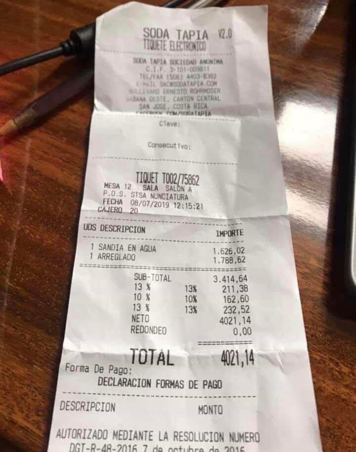 En Twitter circuló la fotografía de una factura de una soda costarricense en la que el usuario destacó que le cobraron el 26% de impuesto de valor agregado (IVA).