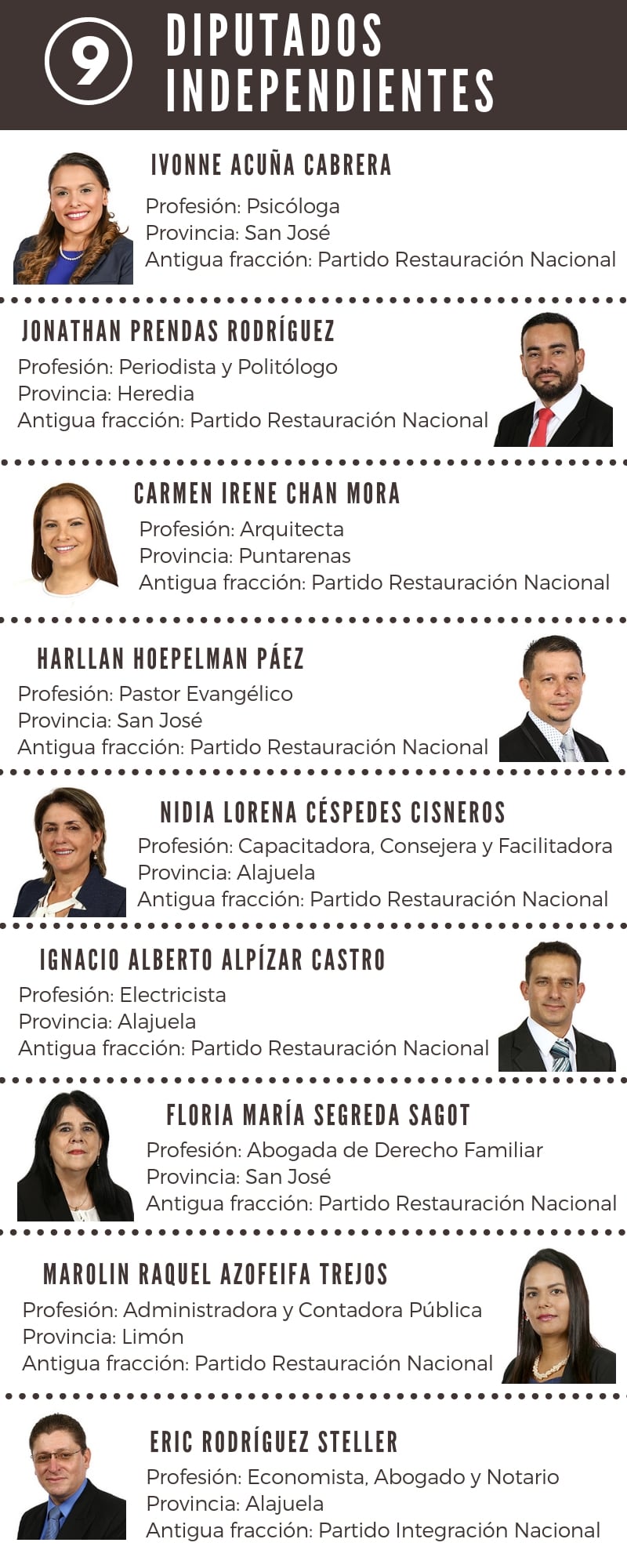 Actualmente hay 9 diputados independientes: 8 que se fueron de Restauración y 1 que se fue del Partido Integración Nacional. Son estos: