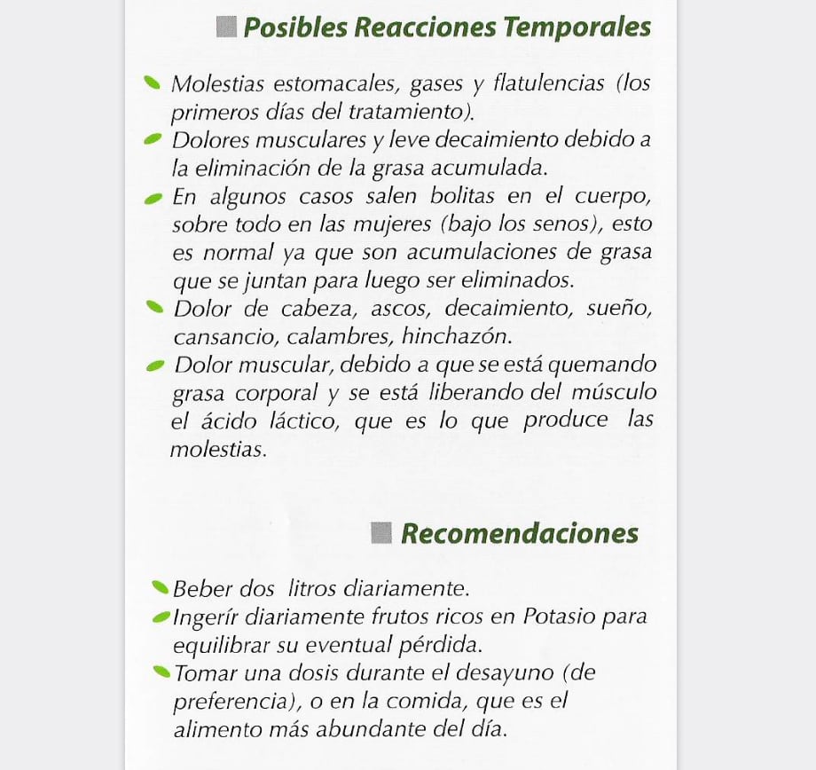 “La queja mayor por el consumo de este producto fue diarrea, gases, dolor abdominal, dolor de cuerpo, cansancio, somnolencia, entre otros. Debemos considerar que nada garantiza que este producto o cualquier otro sin registro sanitario no contenga en su formulación otro tipo de contaminantes o sustancias activas no naturales, que pueden ser fármacos de prescripción controlada o hasta sustancias prohibidas”.