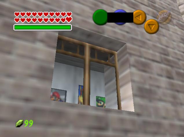 Al llegar al patio donde se encuentra Zelda por primera vez, siendo un niño, si miras por la ventana de la derecha en diferentes ángulos es posible ver a Mario, Bowser, Luigi, Peach y Yoshi.