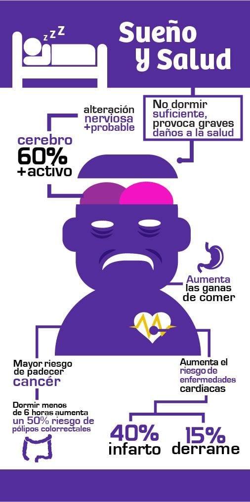 Por otro lado, tener sueño de poca o mala calidad activa las hormonas que afectan el apetito y promueve el almacenamiento de carbohidratos que conduce al aumento de peso. Asimismo, el sueño puede afectar la salud del corazón: no dormir lo suficiente puede aumentar el riesgo de enfermedad cardíaca al aumentar la presión arterial, las hormonas del estrés y los latidos cardíacos irregulares.