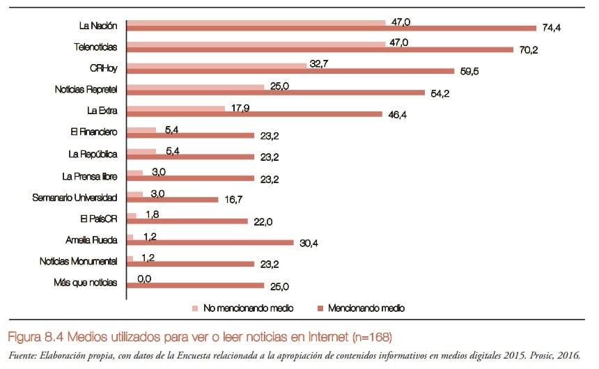 La investigación coloca a La Nación como uno de los medios digitales que más frecuentemente utilizan los ticos para informarse, un indicador -según los especialistas- de que los medios informativos consolidados previamente por fuera de los espacios digitales, tienen una ventaja en la recordación y fidelidad de la ciudadanía.