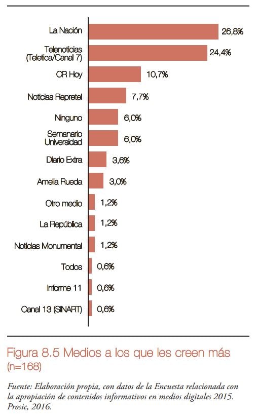 La encuesta también muestra a La Nación como el medio que posee mayor credibilidad en Costa Rica. Ante la pregunta “¿a cuál medio digital le cree más?”, La Nación se posiciona en el primer lugar, con 26,8%. En segundo lugar se menciona a Teletica, con 24,7% y muy por debajo se encuentran otros medios como CRHoy (10,7%) y Noticias Repretel (7,7%).