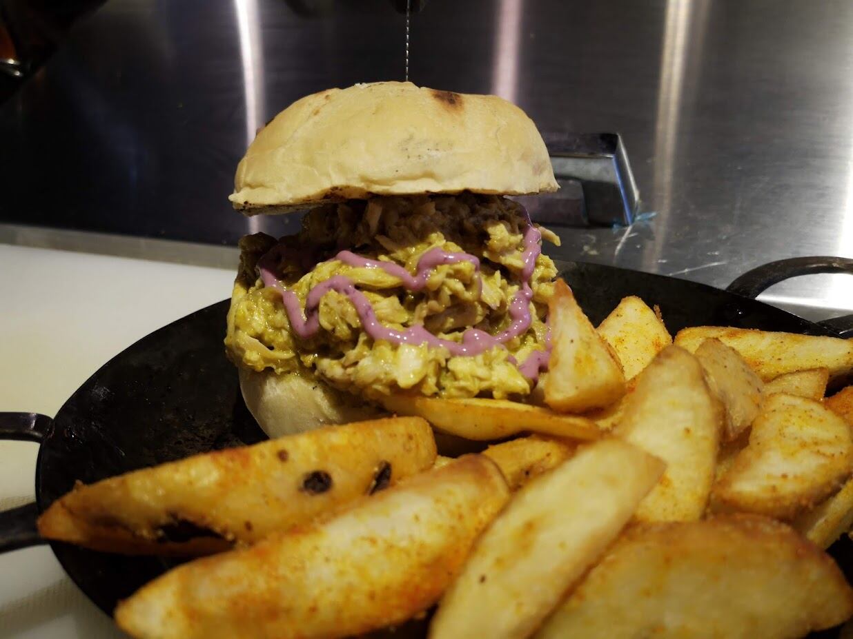 Llegó el momento para trasladarme al sur y volver a sentir una explosión en el paladar. Solamente era pan, gallina y una salsa. Estaba buenísimo. Las papas geniales, pero siguen ganando las de Don Döner.