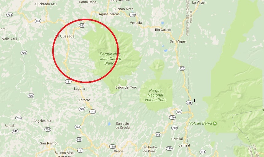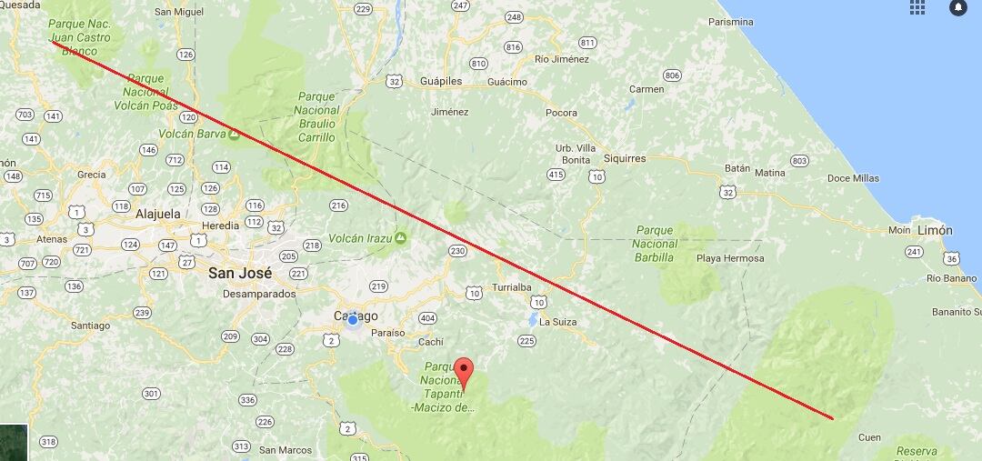 Con respecto a esta imagen, la Fila de Matama se aleja 122 kilómetros al sureste del volcán Poás.