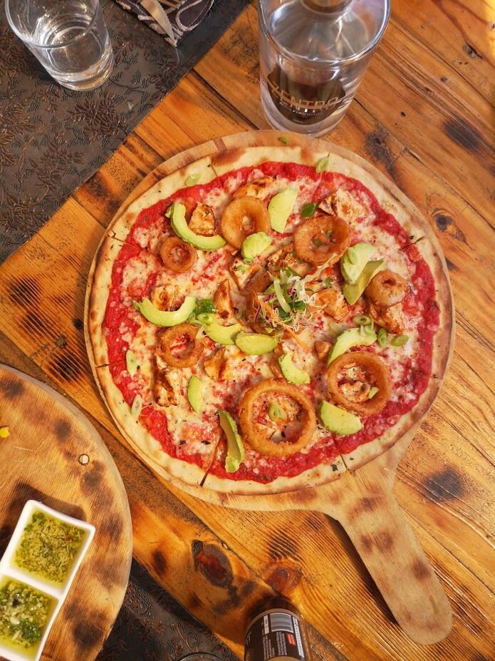 Un tercer párrafo para no extender el anterior y para cerrar con que la pizza de pollo barbacoa con aguacate y aros de cebolla resultó diferente y exquisita.