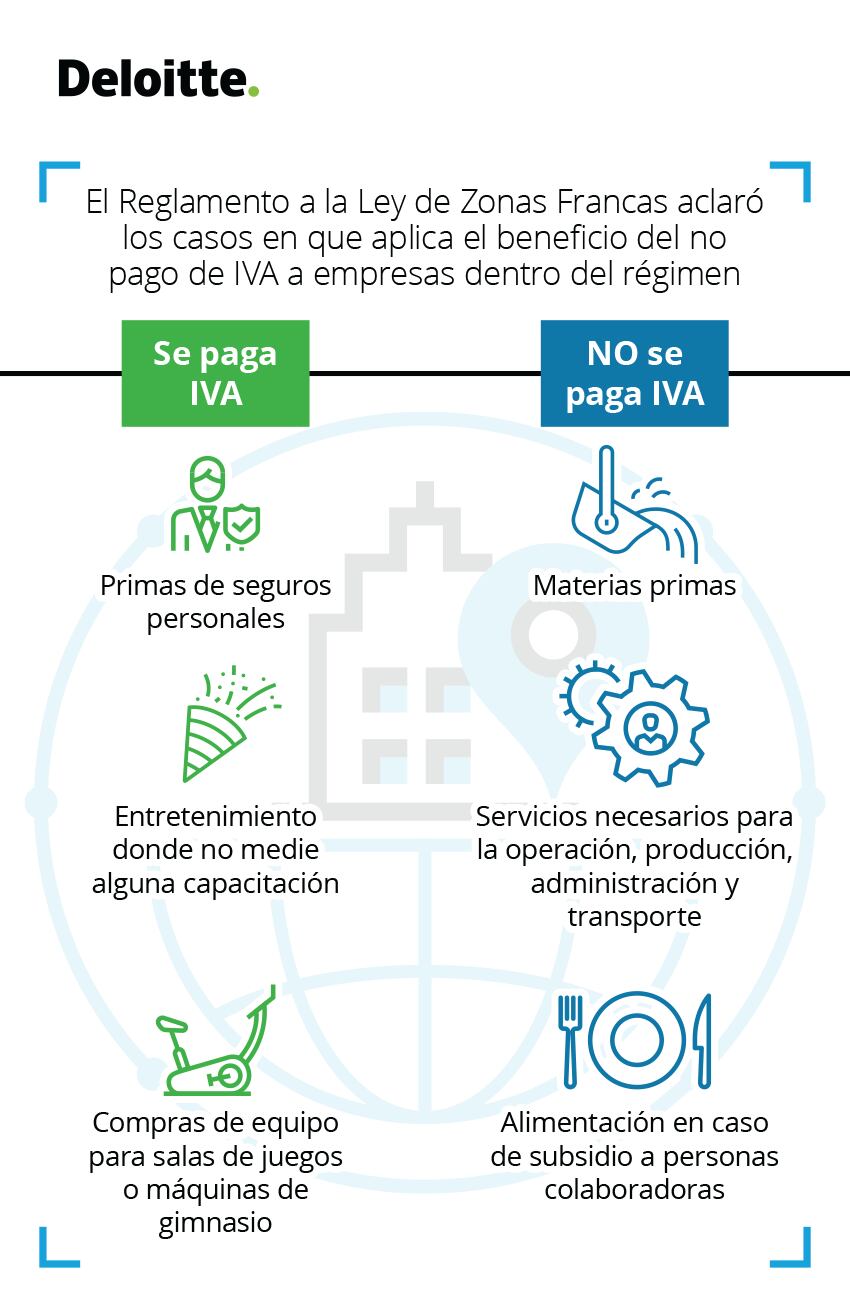 Las empresas del Régimen de Zonas Francas tienen como incentivo poder comprar bienes y servicios sin el pago del impuesto al valor agregado, no obstante, esto no aplica para la totalidad de las compras. Si bien es cierto en la Ley de Fortalecimiento de las Finanzas Públicas no se agregaron limitaciones, es mediante el Reglamento a la Ley de Zonas Francas donde sí se estable cuando es que se pueda gozar del beneficio.