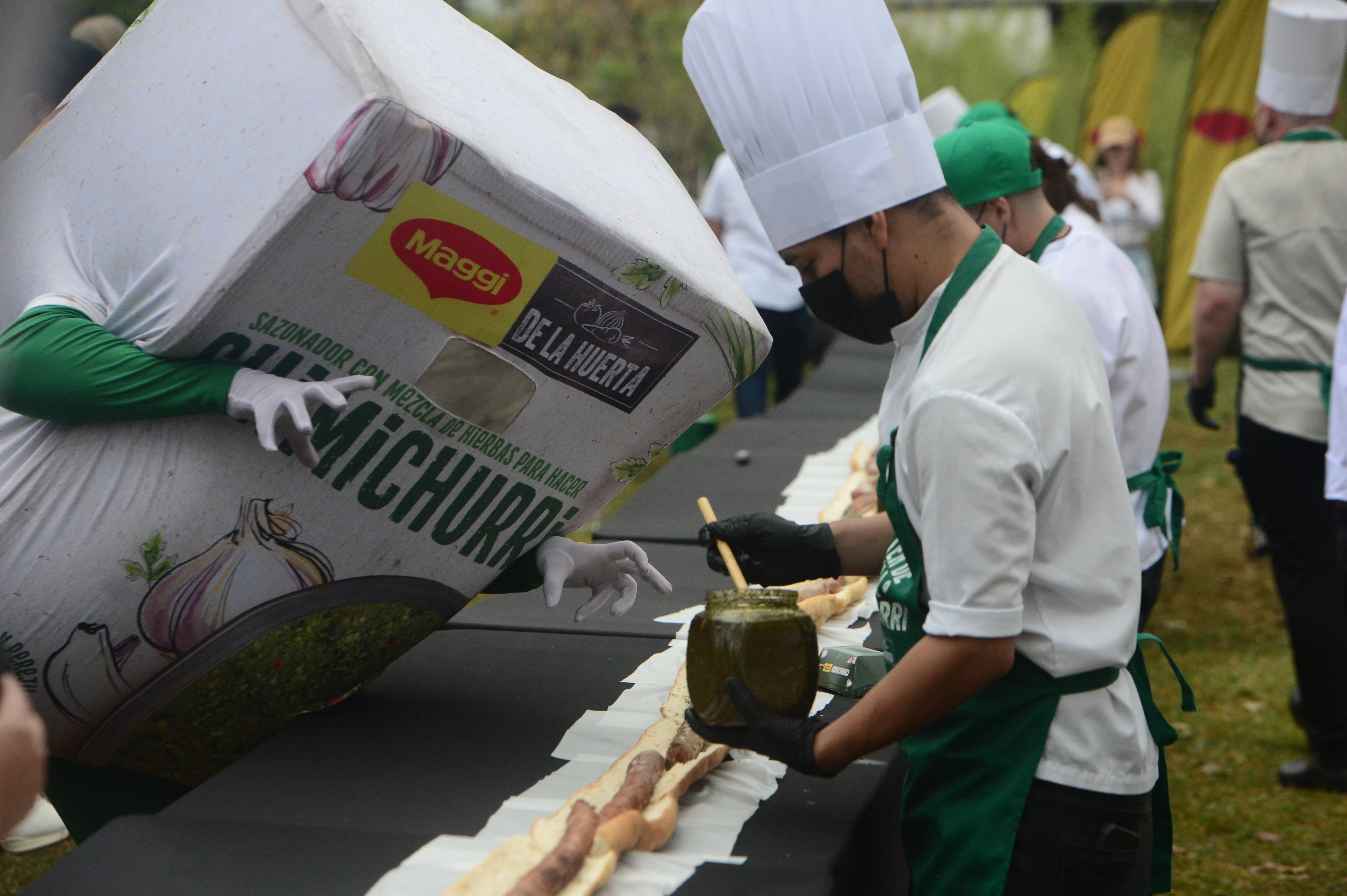 Con una preparación meticulosa y coordinación precisa, el equipo inició mezclando 150 sobres de Chimichurri Maggi® de la Huerta, para luego cocinar 134 kilogramos de chorizo en las parrillas y colocarlos sobre 184 bollos artesanales de 60 centímetros cada uno.