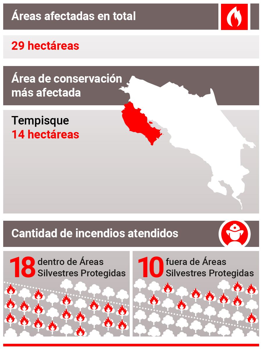 Estos son algunos datos sobre incendios forestales en el país entre el 1. de enero y el 3 de febrero del 2019, según información brindada por el Sinac: