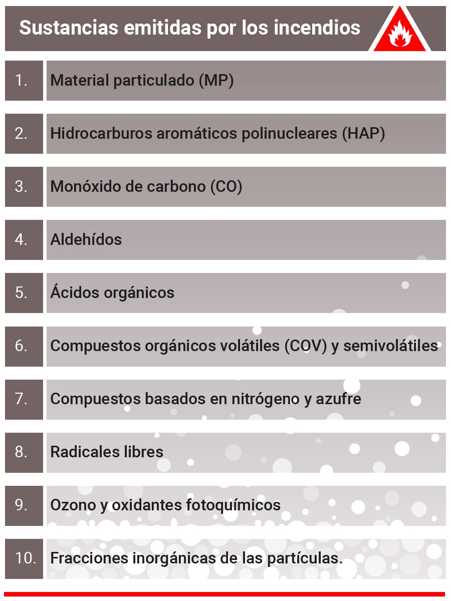 En un estudio realizado en Estados Unidos a finales de la década de 1980 se identificaron las sustancias emitidas por la combustión en incendios destructivos, tomando en cuenta sus efectos en la salud de los bomberos. Algunas de ellas, además, terminan en la atmósfera.