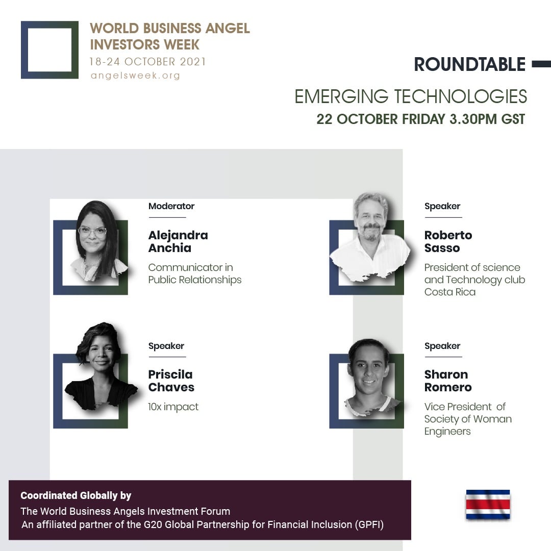 En la mesa de tecnologías emergentes participarán el presidente del Club de Investigación Tecnológica de Costa Rica y fundador de TEDxPuraVida, Roberto Sasso; la vice presidenta de la Sociedad de Mujeres Ingenieras, Sharon Romero y Priscilla Chaves de 10x Impact.