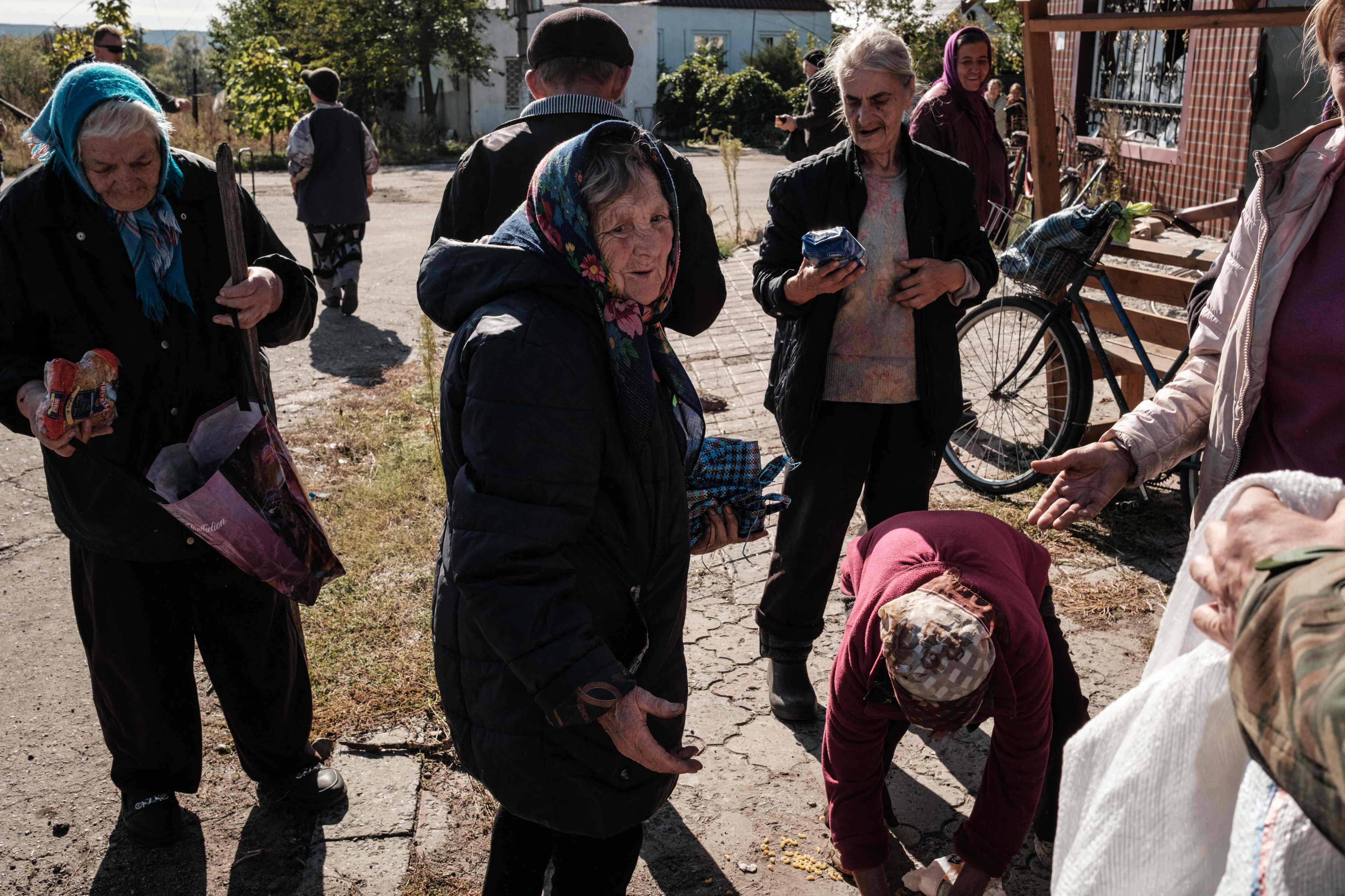 En Drobysheve, una fundación caritativa evacua a los habitantes. Valentina, de 78 años y con un fular azul, espera con su marido en el furgón de evacuación.