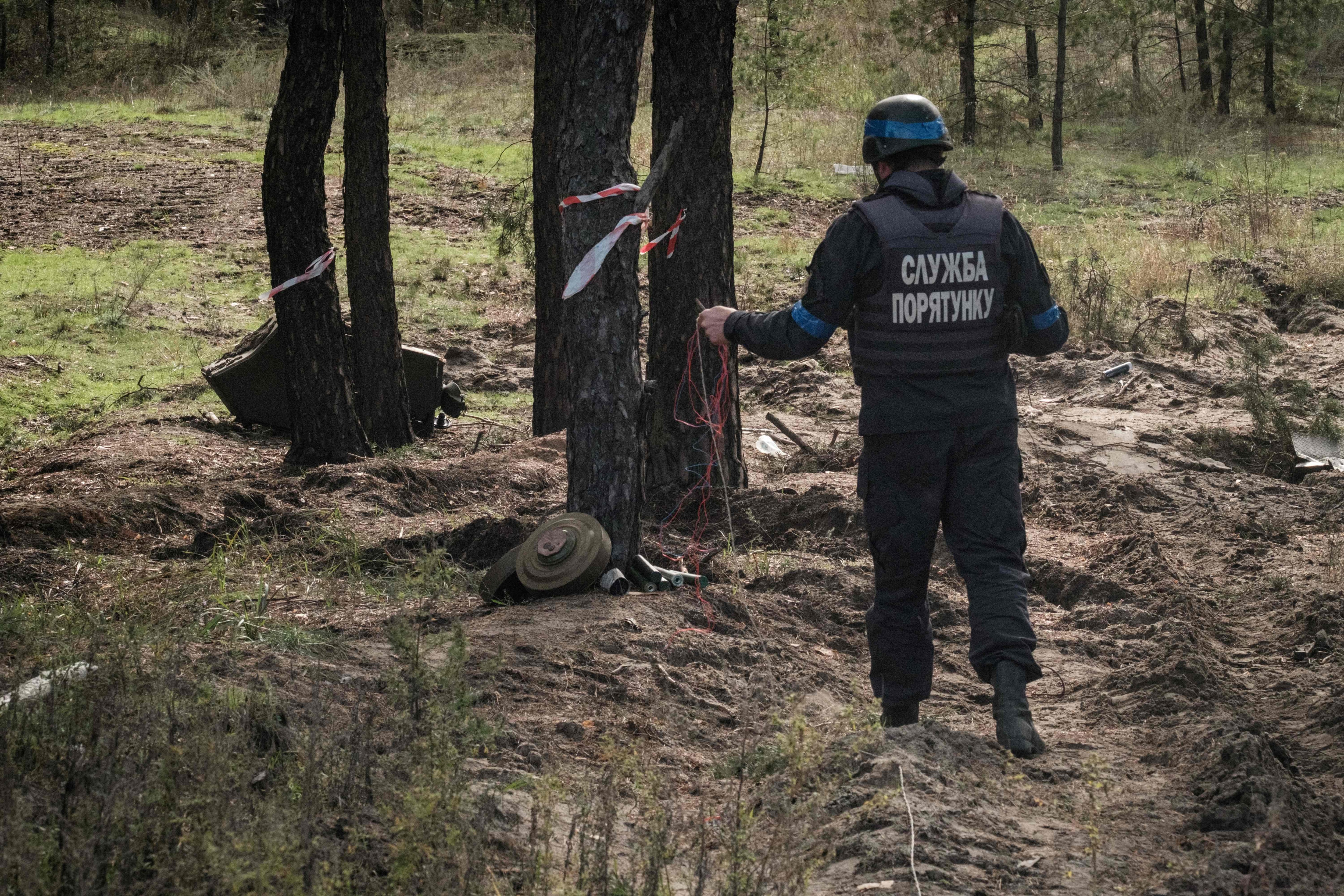 Cerca de Dobrysheve, a menos de 5 km de Limán, un desminador ucraniano con un detector de metales en la mano avanza lentamente por un bosque donde todavía hay cadáveres de soldados rusos.