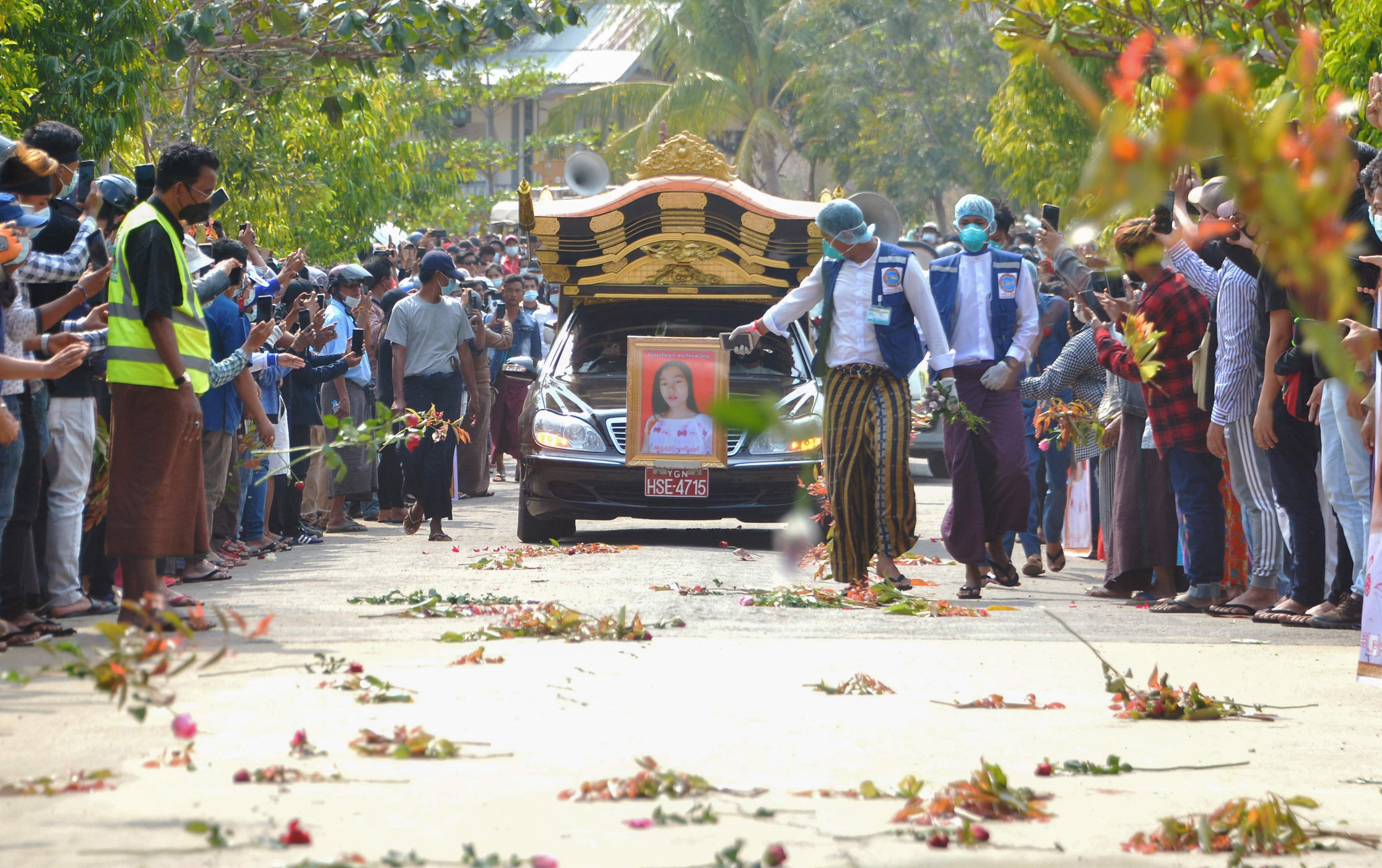 Los funerales de Mya Thwate Thwate Khaing, herida de bala en la cabeza y fallecida diez días después de haber estado en cuidados intensivos, tuvieron lugar en la periferia de Naipyidó, en presencia de miles de personas.