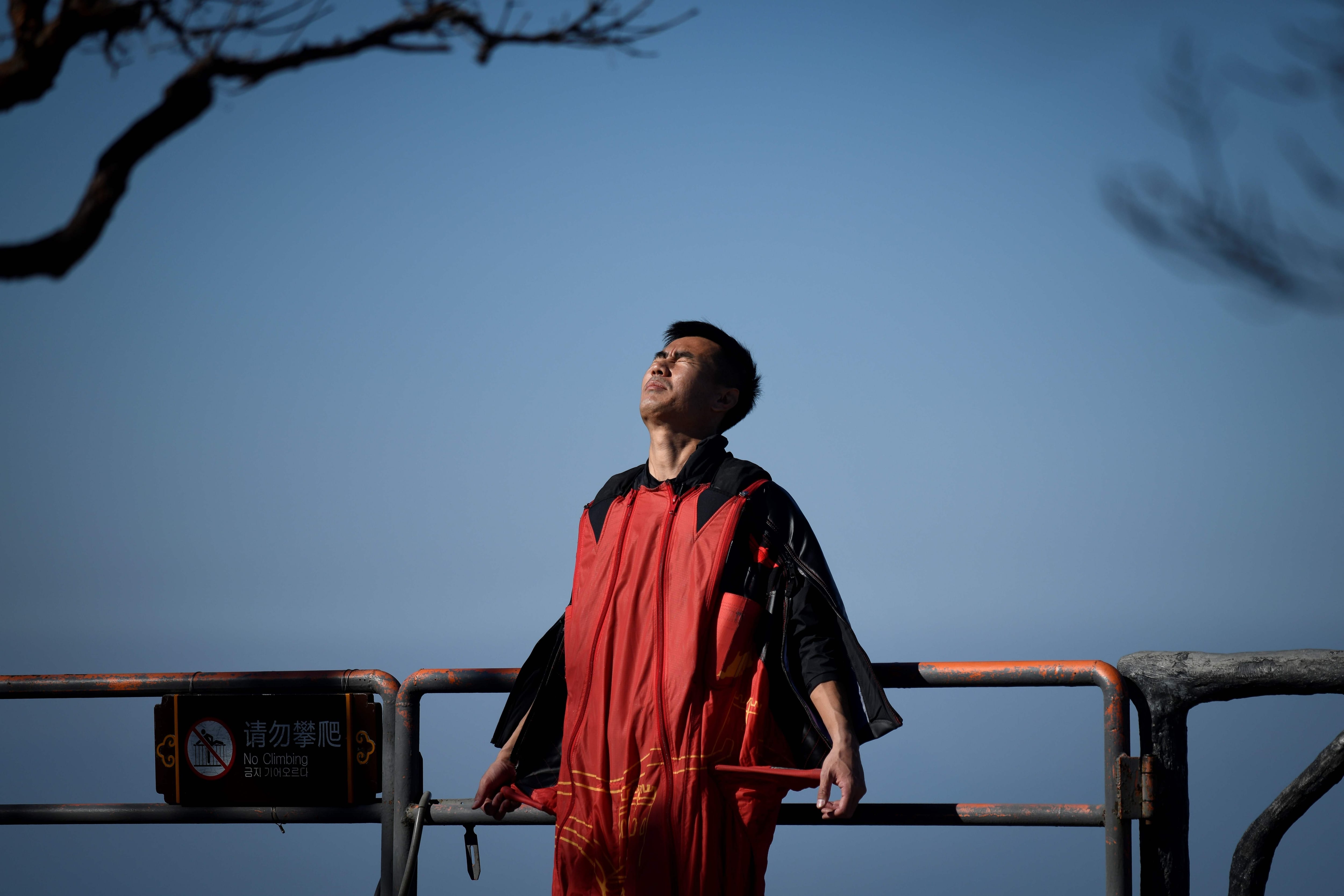 'Cuando subo a pie hasta la cima, mi ritmo cardíaco se acelera. Pero durante el vuelo estoy hipertranquilo', explica vestido con su uniforme rojo adornado con una Gran Muralla amarilla, símbolo de su país.