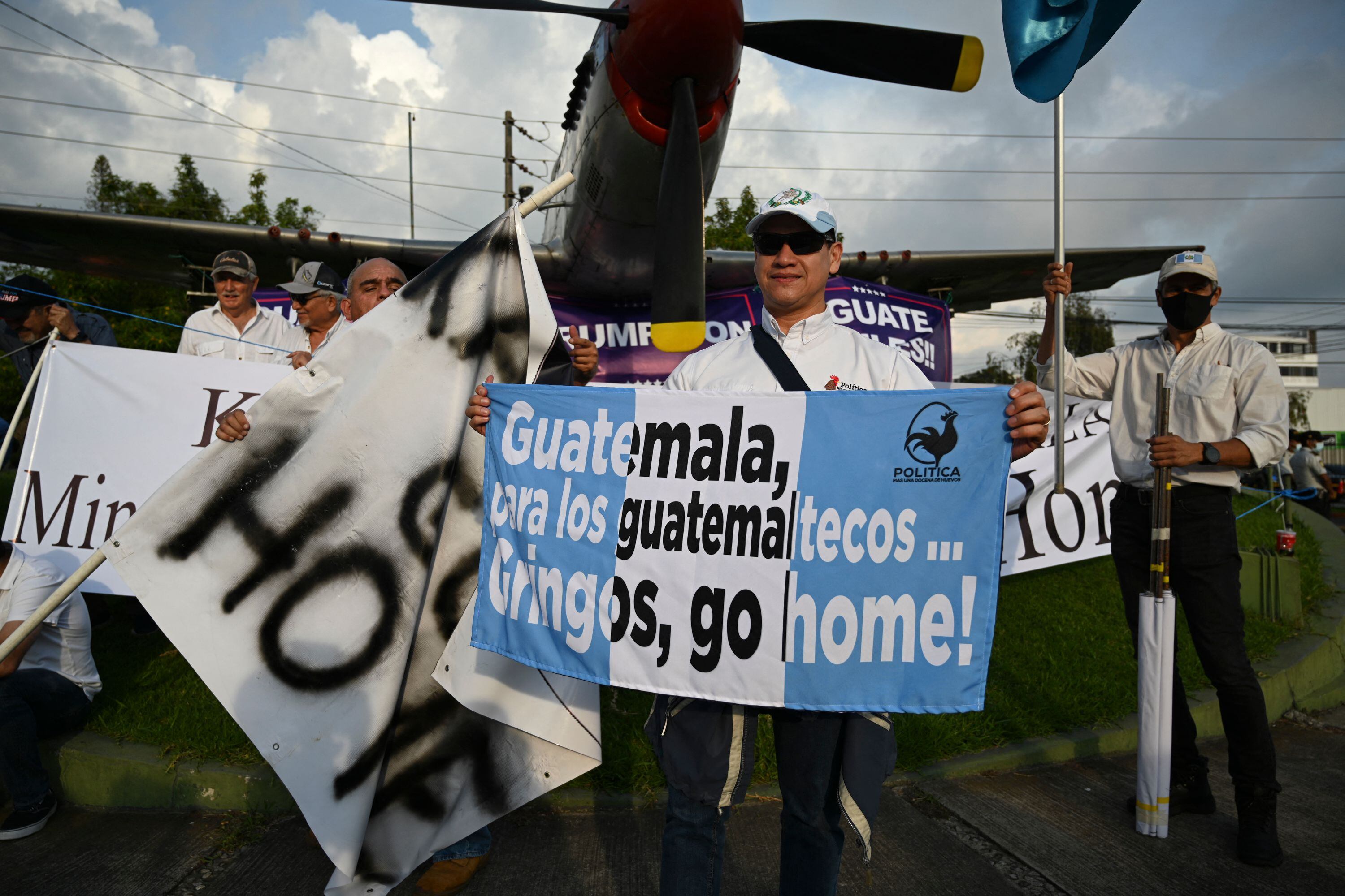 Un pequeño grupo de manifestantes guatemaltecos, vinculados a grupos de derecha y militares retirados, simpatizantes del expresidente Trump, rechazó la llegada de Harris fuera de la FAG al acusarla de “marxista” y de querer manipular al país con sus “políticas de izquierda”.