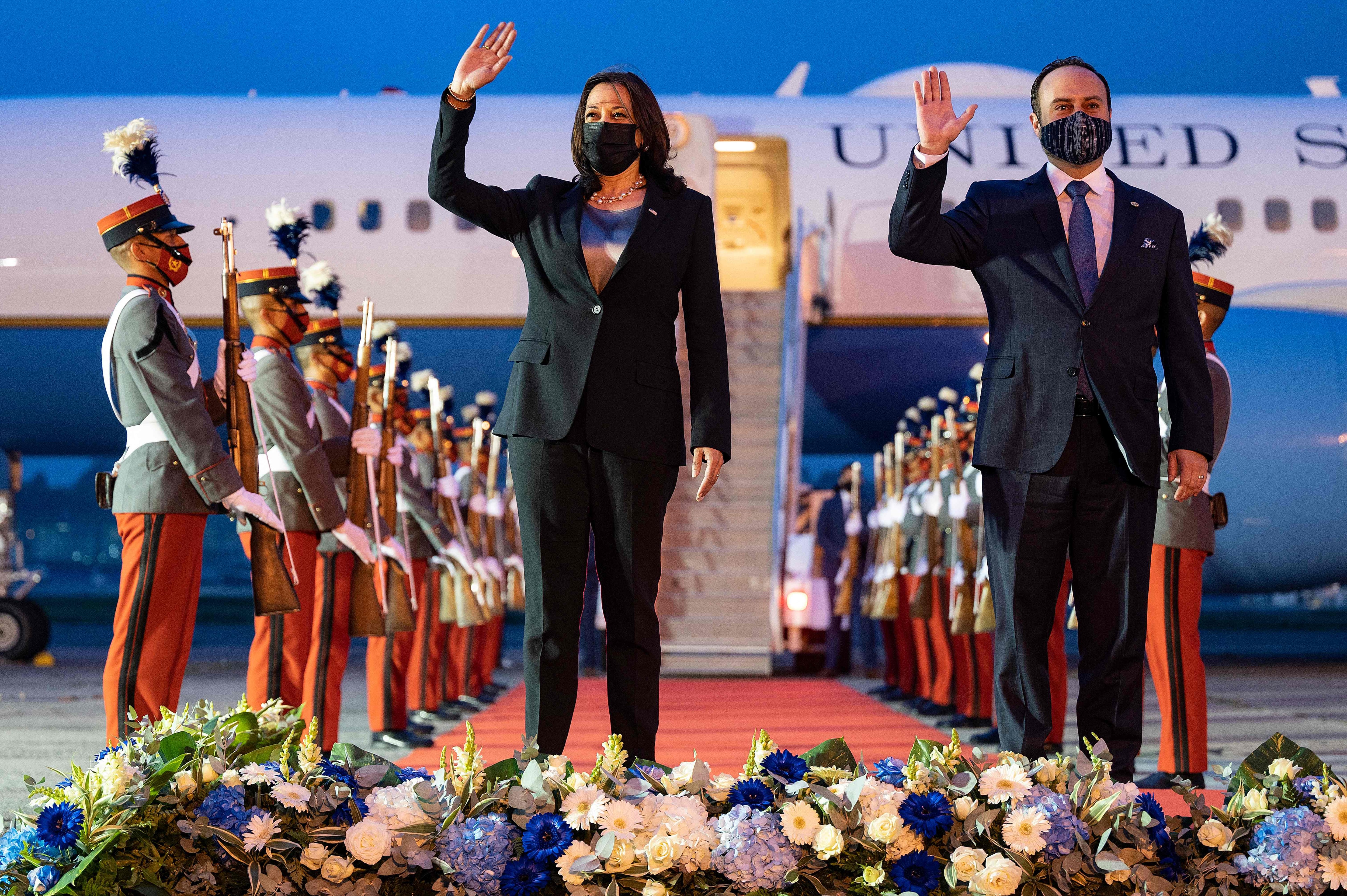 Vistiendo traje oscuro y mascarilla, la vicepresidenta arribó a las 6:18 p.m. (hora local) a la base de la Fuerza Aérea Guatemalteca (FAG), en el sur de Ciudad de Guatemala, en su primer viaje a América Latina.