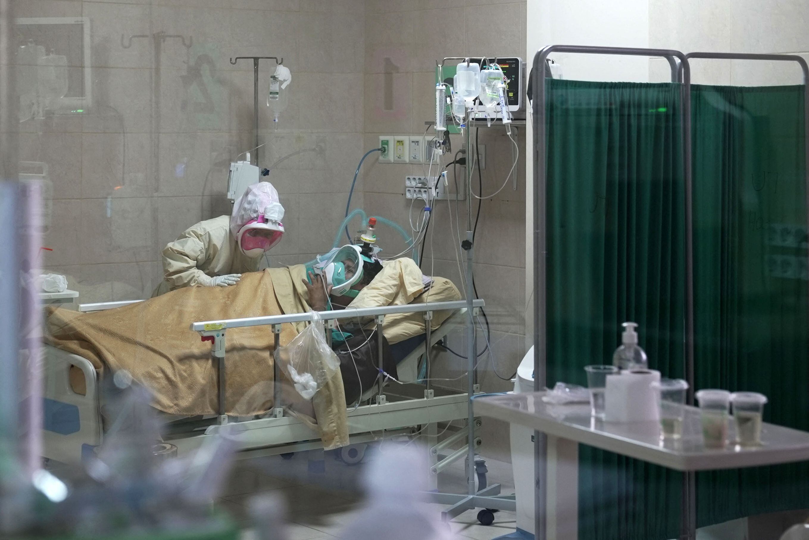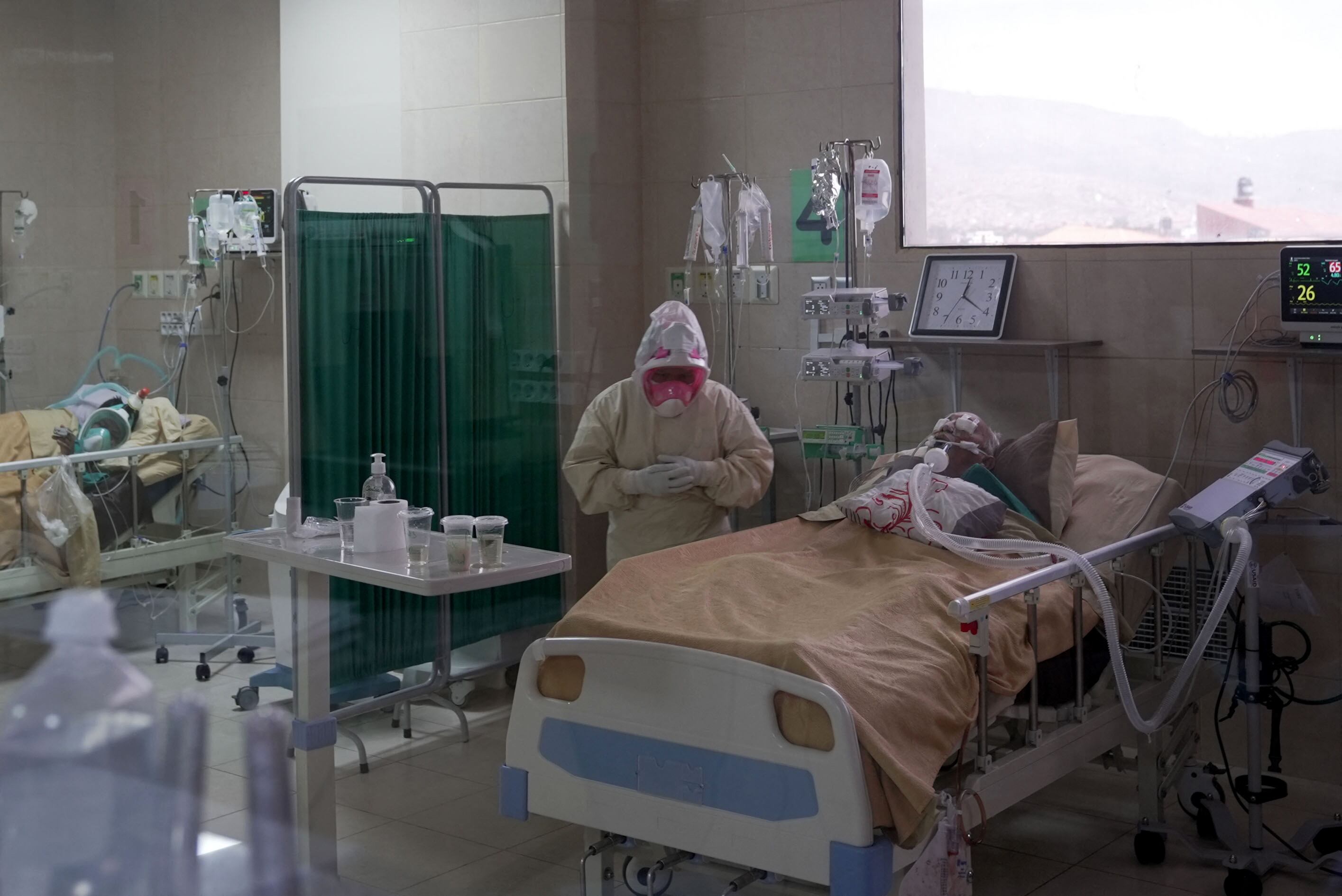 El doctor Daniel Quispia señala la pantalla llena de numeritos. “Donde dice 25, debería decir 75” para que el oxígeno sea suficiente. Con 36 años, es el único intensivista de turno a cargo de los pacientes en el Hospital del Sur de Cochabamba.
