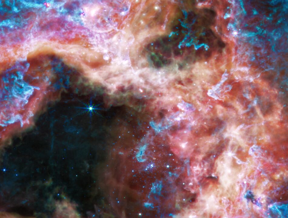 La cámara principal del telescopio, la cámara de infrarrojo cercano (NIRCam), descubrió que la cavidad en el centro de la nebulosa fue ahuecada por la radiación transportada por los vientos estelares, los cuales emanan de un cúmulo de estrellas masivas jóvenes, que aparecen como pálidos puntos azules.