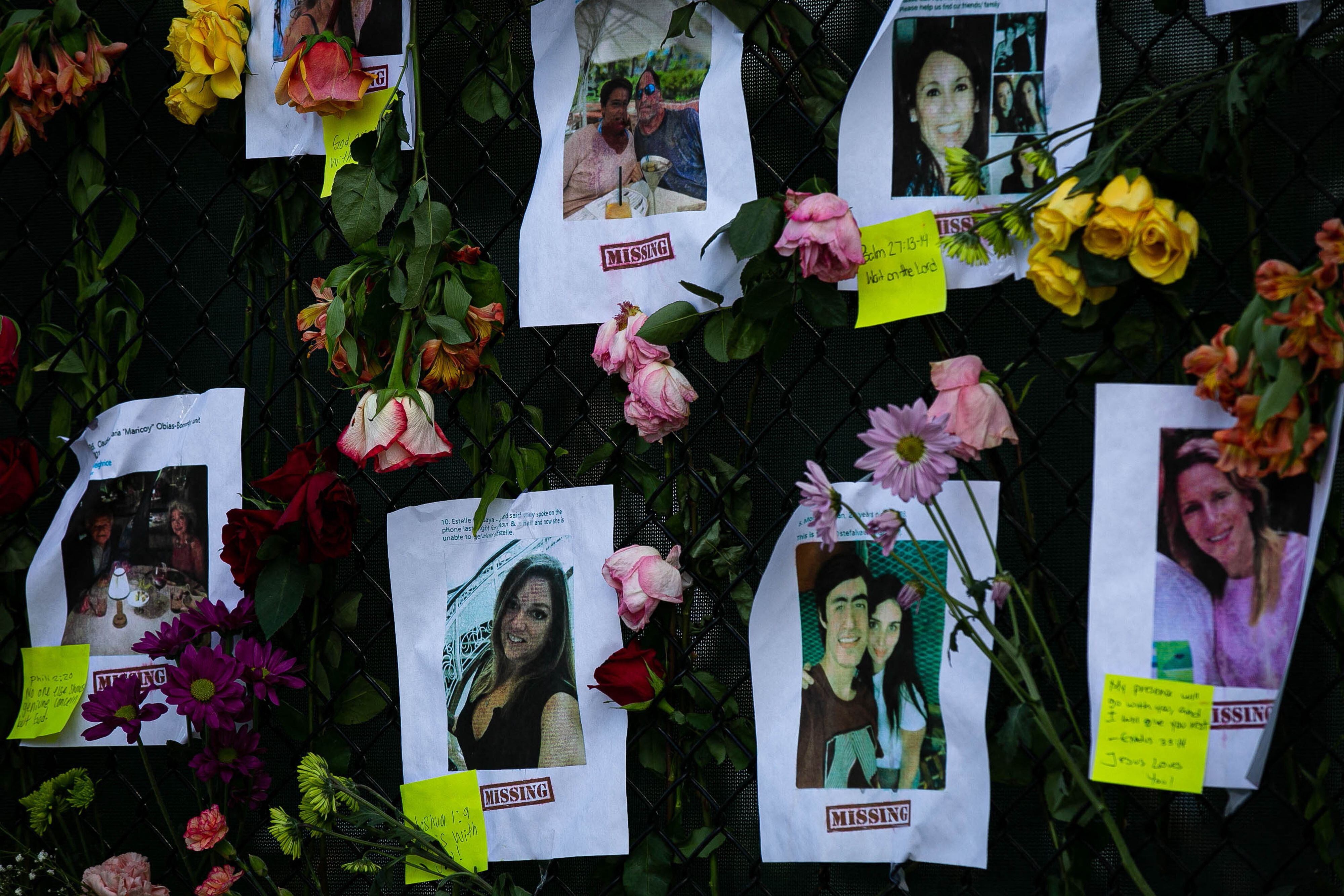 En las rejas colgaron ramos de flores, mensajes de apoyo y los nombres de varios desaparecidos, con el número de su apartamento.