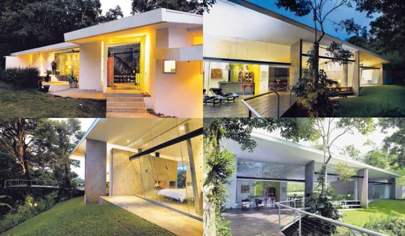 Tras un acceso empinado, aparece la vivienda extendida a lo largo de lo más plano del lote, paralela a los árboles tupidos que cubren un fuerte declive del terreno y que acaba en la cuenca de una pequeña quebrada.