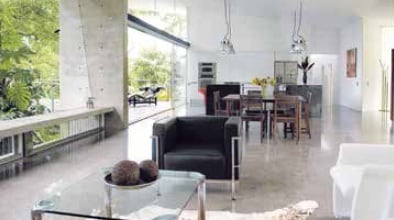 Además de la planta libre, el sentido de loft queda reforzado por cuatro lámparas de corte industrial, el piso de concreto pulido y las paredes de concreto chorreado. A esto se le suma la extensa ventanería inclinada, que aumentan la percepción del tamaño del espacio y acercan el entorno, paños corredizos en ambos extremos y celosías.