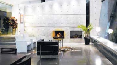 Esta pared parece flotar, etérea, en medio de la ventanería, ya que no tiene ningún fin estructural, y permite ver los fustes de las chimeneas, la textura de la formaleta y los orificios que sirvieron para prensarla durante la chorrea. Los mismos detalles se repiten en la pared que separa la habitación y el cuarto de baño.