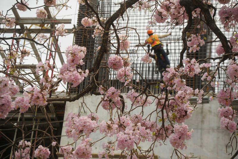 Florece de enero a abril y su rosáceo color hace difícil que pase inadvertido en San José. Su nombre científico es Tabebuia rosea , aunque comúnmente se le conoce como roble sabana.
