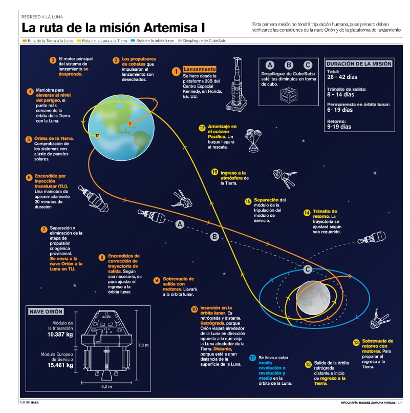 El trabajo consiste en un viaje de ida y vuelta hacia la Luna, en el que se verán las condiciones que enfrentará para llegar allá el nuevo sistema de lanzamiento de cohetes (SLS, por sus siglas en inglés) y la nave Orión. Así se harán los ajustes necesarios para albergar humanos.