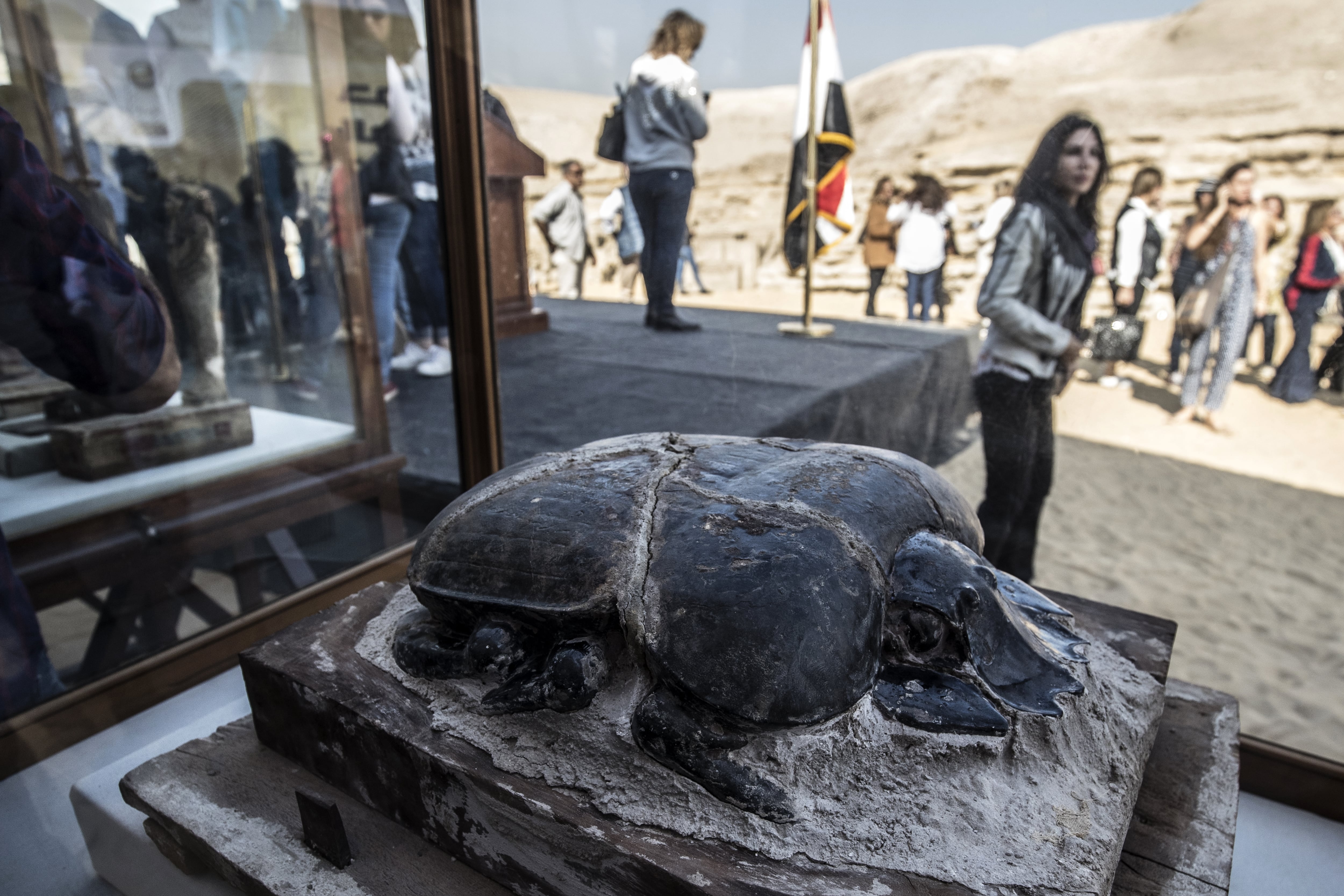 Los arqueólogos también encontraron estatuas de madera y bronce que representan a la antigua diosa Bastet y un escarabajo de piedra grande, que Mostafa Waziri, secretario general del Consejo Supremo de Antigüedades, describió como “el más grande del mundo”.