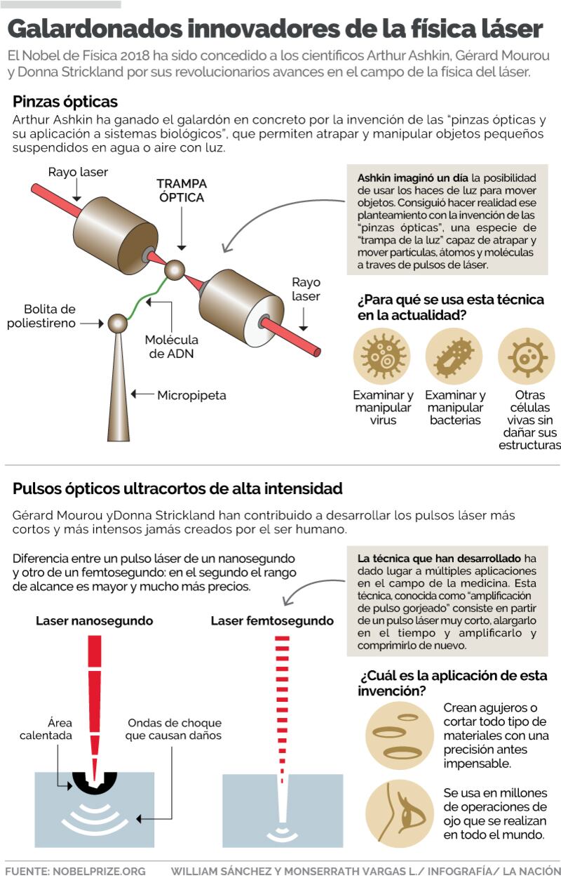 Rayos láser de alta intensidad que se utilizan para efectuar cirugías correctivas de vista y pinzas ópticas que pueden sujetar partículas, átomos, virus y otras células vivas son los avances científicos que galardona el premio Nobel de Física 2018, otorgado por la Real Academia Sueca de las Ciencias.