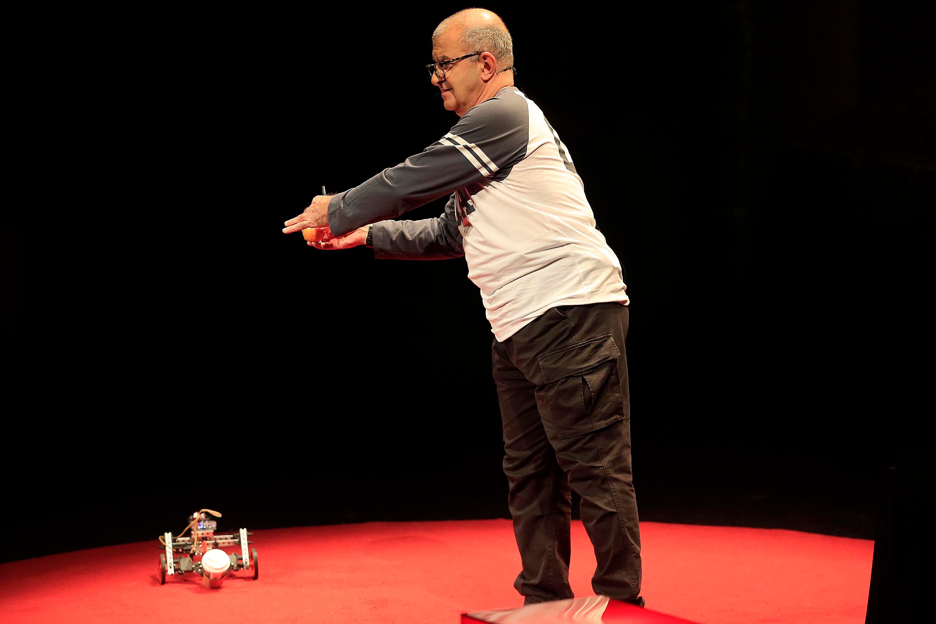 Con manzanas, diagramas y hasta un robot que le llevó un café, Gandour explicó acerca de los concpetos como cuántums (unidad básica de la computación cuántica) y para qué sirve.