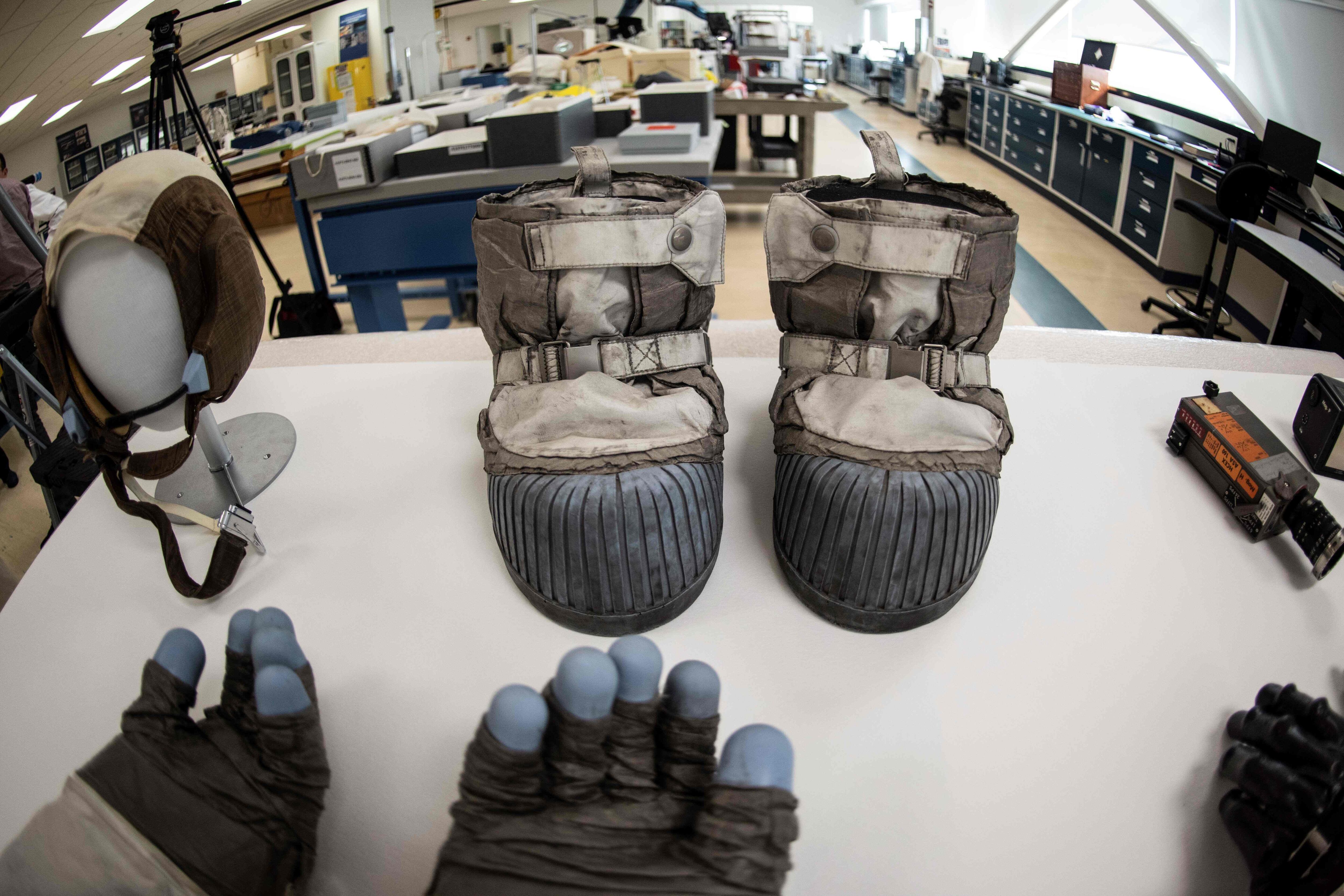 Lewis muestra las botas de fibra de acero y las suelas de silicona azul de Gene Cernan, el último hombre en pisar la Luna en 1972, en el marco de la misión Apolo 17: estuvieron tres largos días en la Luna y conservan de esa estancia un velo negro de suciedad.