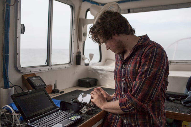 Atlantic City, Nueva Jersey A ocho kilómetros de la costa, el científico Michael Crowley lanza tres naves no tripuladas desde la parte trasera de la embarcación.