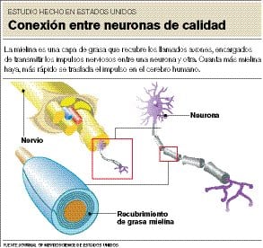 Según los expertos, la calidad de la sinapsis depende de la velocidad con que viaja el impulso nervioso por el cerebro y esa velocidad es proporcional al diámetro de cada axón. A su vez, el grosor del axón está determinado por un recubrimiento natural de grasa –llamada la mielina– que envuelve cada uno de de ellos.