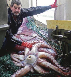 El “calamar colosal”, que llega a alcanzar los 14 metros de largo, caza con dos tentáculos prensiles que sobresalen sobre otros ocho más pequeños y que están dispuestos de ventosas y garfios con los que mata a sus presas.